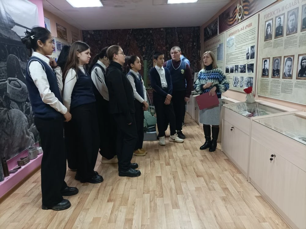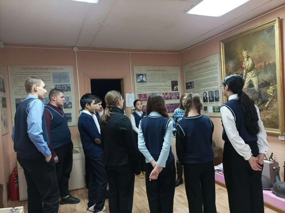 У стенда «Гордость и слава земли Новодугинской» в Зале Воинской Славы учащиеся прослушали лекцию о героях-земляках, вспомнили подвиг юного героя Вани Федорова, услышали рассказ экскурсовода о воинах-интернационалистах, воевавших в Афганистане, и земляках, погибших в СВО. Старшеклассники приняли активное участие в тематической викторине «Герои Отечества».
