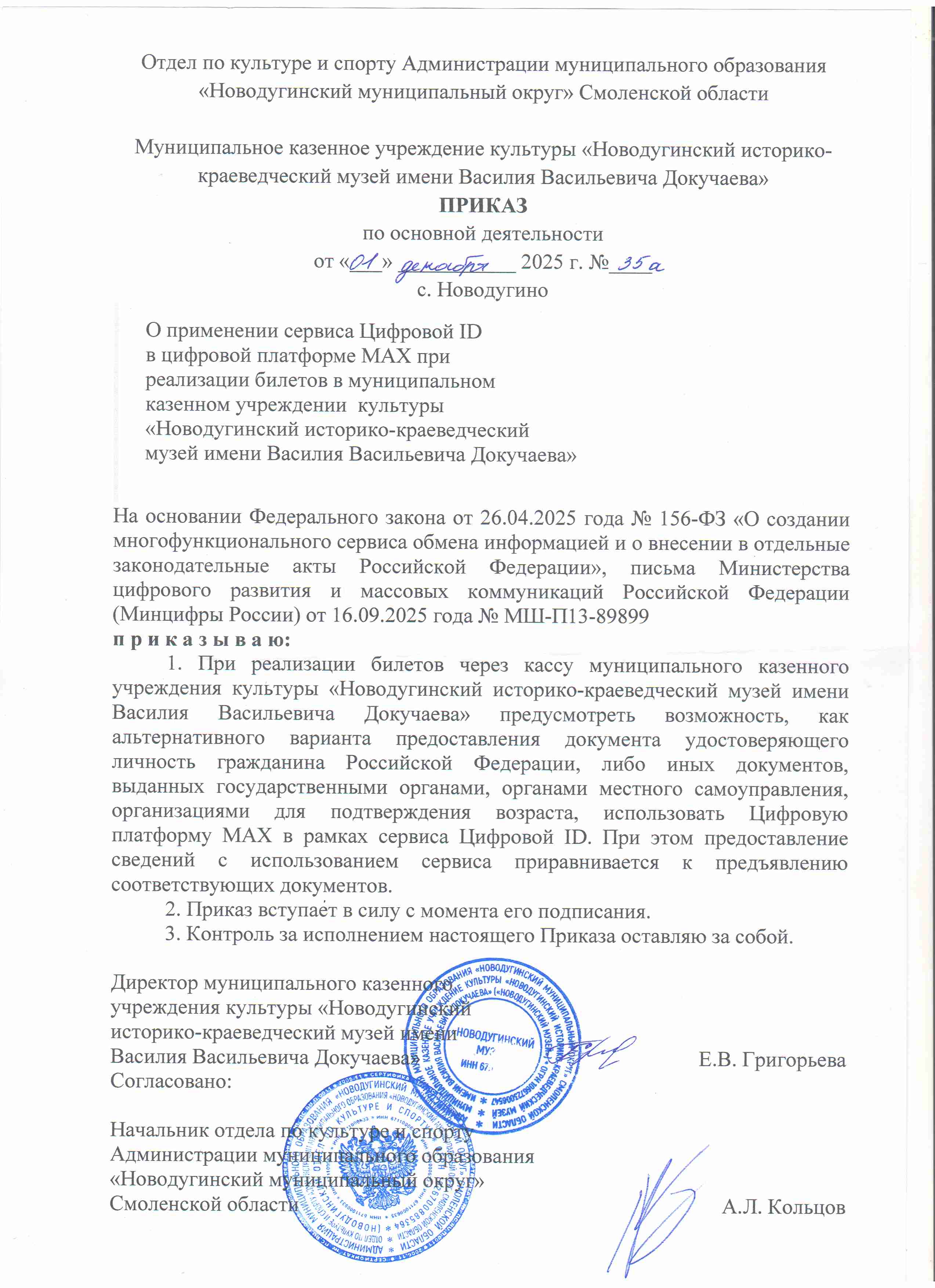 Приказ о применении сервиса Цифровой ID в цифровой платформе МАХ приреализации билетов в муниципальном казенном учреждении культуры «Новодугинский историко-краеведческий музей имени Василия Васильевича Докучаева» /files/246/prikaz-o-primenenii-servi.jpg